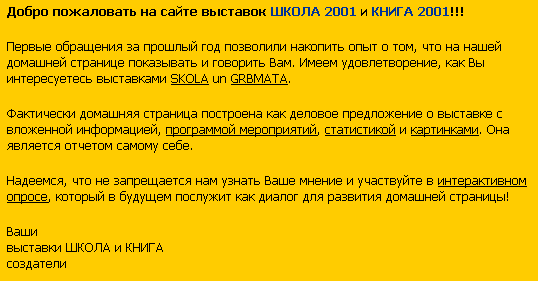 Виталия знакомит нас с душевным прибалтийским сайтом, посвященным выставкам Школа-2001 и Книга-2001. Уж и не знаю, какие школы и книги там имеются в виду, но надеюсь, что это не русскоязычная литература! Хотя сама страничка - русскоязычная. Но какая!