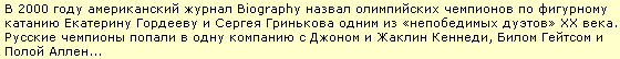 Ну, что Джон с Жаклин Кеннеди были чемпионами по фигурному катанию - новость довольно своеобразная. Хотя, врать не буду, у богатых свои причуды, так что почему бы и нет. А вот что правая рука Гейтса и нынешний президент Майкрософт Пол Аллен - женщина, вот это уже новость так новость! И даже их тайное увлечение фигурным катанием, о котором мир узнал благодаря "Комсомольской правде", меркнет перед этим сообщением как подвальная лампочка по сравнению с солнцем. Остается только одно выяснить: Пол раньше был теткой, еще до расцвета Майкрософта, или он сейчас стал таковой, сделав дорогостоящую операцию? Но об этом "Комсомольская правда", увы, умалчивает.