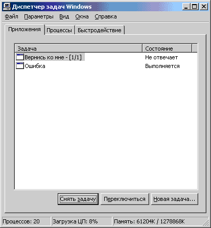 Вернись ко мне - не отвечает, а ошибка выполняется. Еще бы, ведь ЦП загрузился всего на 8%. То есть он все эти проблемы вообще в голову не берет, зараза!