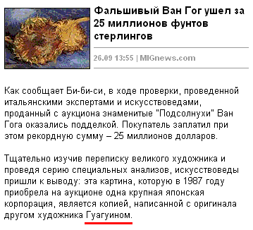 Вот такие дела. Какой-то паршивый Гуагуин внаглую переписал Ван Гога. И теперь эту фальшивку продали за бешеные бабуськи. Правда, если бы искусствоведы, писавшую эту прелестную заметку, хотя бы чуть-чуть напряглись и внимательнее прочитали фамилию художника, то они с большим удивлением обнаружили бы, что непонятный Гуагуин - это ни кто иной как Поль Гоген... Да-да, тот самый Гоген, который действительно дружил с Ван Гогом. И был он вовсе не Гуагуин. И ездил он вовсе не на машине марки "Пеугиот", и на завтрак он ел вовсе не круазанты, да и жил он не на Гуавуайийах, и ухо себе вовсе не отрезал. Это Один Гог себе ухо отрезал. Впрочем, имеются факты, которые доказывают, что ухо ему все-таки отрезал Гоген. По пьяни. Он, когда выпивал, становился просто каким-то Гуагуином, честное слово!