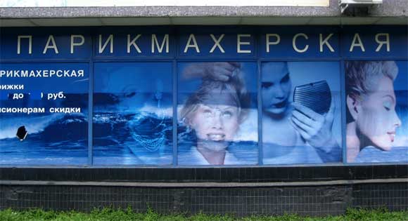 Наталья К. интересуется, что в этой парикмахерской делают с посетителями. Объясняем - скальп снимают, там же хорошо видно. Всего-то пара косяков, выкуренных художником, а какую мощь и глубину приобретают рекламные плакаты.