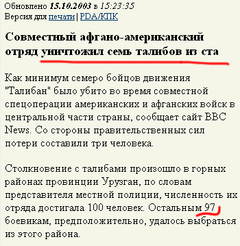 Значит так. Уничтожили 7 талибов из ста. Остальным 97 удалось выбраться. Как? - спрашивает Askar. Отвечаю. Может, четверо были не до конца уничтожены. Может, отряд просто уничтожил их боевой дух, показав во время боя фильм "Блондинка в законе 2"? И они ушли, но воевать больше не будут. Или наоборот - четверо из уничтоженных талибов были не талибами, а случайными прохожими. Поэтому их при подсчете не подсчитали. Да нет, бред какой-то получается. В общем, будем считать четырех талибов - уничтоженными условно. Пускай во время следующего боя они первыми подставляются. Иначе так не честно.