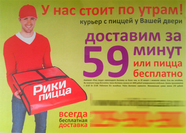 Дмитрий прислал пример очередного быдлокреатива. Интересно, они и правда думают, что это смешно? Впрочем, раз быдлокреатив, быдло на такое должно покупаться, тут не поспоришь. У них стоит по утрам, гы-гы, курьер с паршивой пиццей у нашей двери вечером, гы-гы, лол, абаржака.