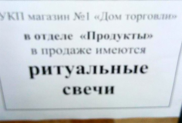 Если же действительно нет такого товара, предлагает Юрий, то в отделе "Продукты" можно купить ритуальные свечи. Их есть, конечно, не нужно, их нужно ритуально вставлять - известно куда.