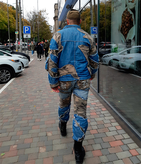 Алекс мучительно пытается понять, что это за вид камуфляжа такой! Наполовину камуфляж, наполовину джинса. А, точно! Это же генерал диванных войск!