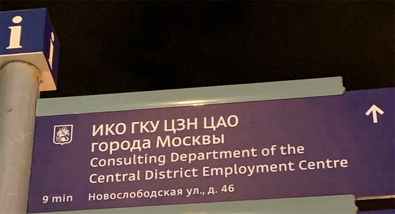 В Москве, считает Алексей, намного удобнее знать английский язык, а не русский. Посмотрите на табличку. Можете понять, что это за контора - по русскому названию? А по английскому - все понятно.