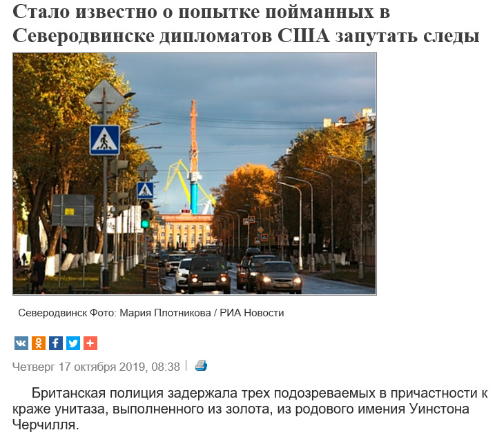 Объясняем. Родовое имение Уинстона Черчилля, как известно, находится в Северодвинске. Дипломаты США оттуда сперли золотой унитаз. А вот почему их задержала британская полиция, а не российская? Да потому что британская полиция приехала в Россию по обмену. Дипломаты же США пытались доказать, что это не унитаз вовсе, а плевательница и они ее взяли, просто чтобы наплевать на международные отношения, а не в целях кражи.