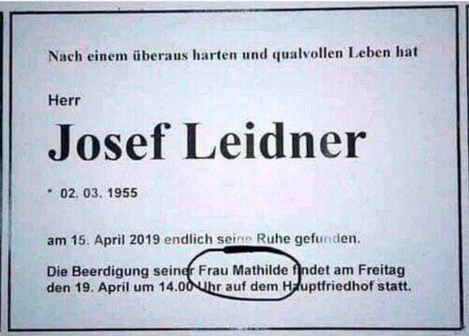 После жизни, полной трудностей и мук, господин Йозеф Ляйднер наконец-то обрел покой. Похороны его жены Матильды состоятся в пятницу 19 апреля в 14 часов на главном кладбище.