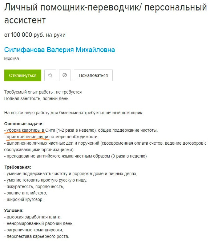 Бизнесмену помощник-переводчик нужен, рассказала Диана. Штоп английский преподавал. И готовил простую русскую пищу. И убирался. И стирал. И гладил. Про сексуальные услуги в объявлении ничего не сказано, но что-то нам подсказывает...
