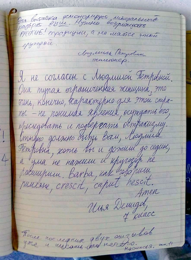 Иногда в книгах отзывов, рассказал Евгений, разворачиваются интереснейшие дискуссии.
