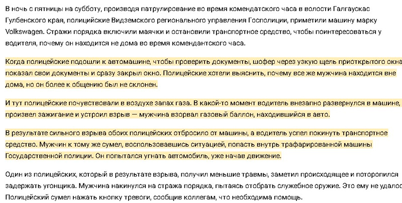Есть еще марвеловские супергерои в волости Галгаускас Гулбенского края, есть, радуется Славик. Взорвал газовый баллон, успел покинуть транспортное средство, воспользовавшись ситуацией, попал внутрь трафарированной машины государственной полиции, попытался угнать, начав движение, - ну чем не Супермен, а?