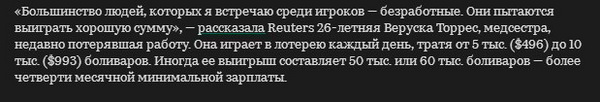 На "РБК" рассказали о бедственном положении простых венесуэльцев, вздыхает Сергей. Безработная каждый день тратит от 500 до 1000 баксов на игру. Иногда ее выигрыш составляет пять-шесть тысяч баксов - это более четверти месячной минимальной зарплаты в двадцать тысяч баксов.