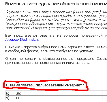 Городской совет Новосибирска, как рассказал UrbanVampire, провел онлайновый опрос у себя на сайте. Посетителям сайта нужно было ответить на разные вопросы, но самый первый - просто поразил их в самое сердце: