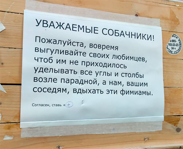 Судя по "парадной", фимиамы прибыли к нам из Санкт-Петербурга. Интересно, автор объявления не перепутал фимиамы с миазмами? А вообще объявление гениальное, здесь всё по-питерски, всё смешано, как в доме Облонских: тут и "уважаемые", и "пожалуйста", и "любимцев", и - "уделывать углы и столбы". Питер как он есть, соединение несоединимого.