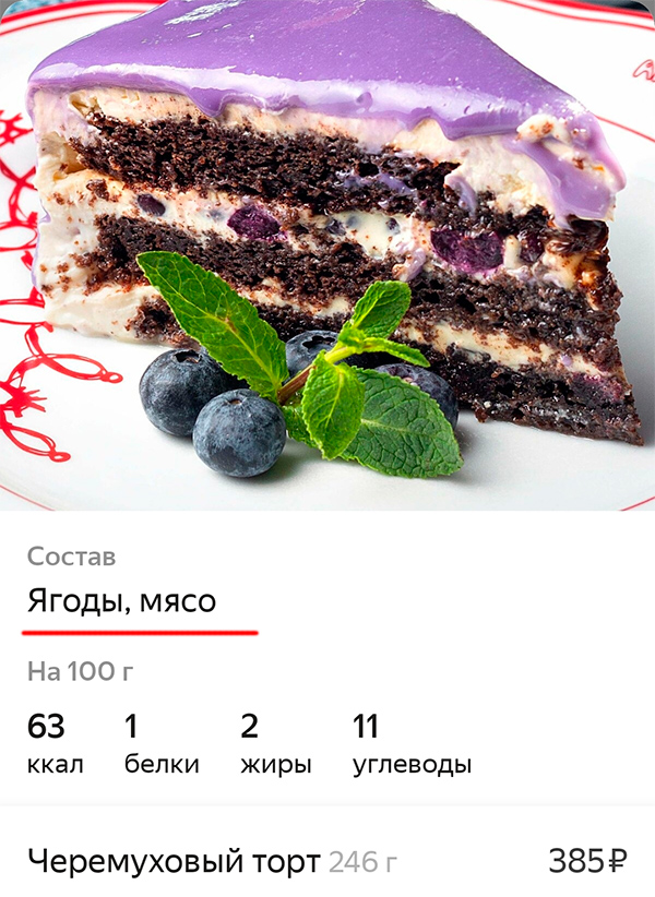 Черемуховый торт мало того, что с мясом, так ещё и без черёмухи, так как ягода на картинке - явно черника)