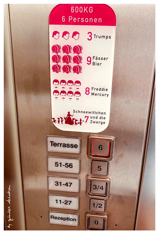 Какая наглядная картинка в австрийском лифте, радуется Екатерина. Три Трампа, девять бочек с пивом, восемь Фредди Меркьюри, семь гномов и Белоснежка.