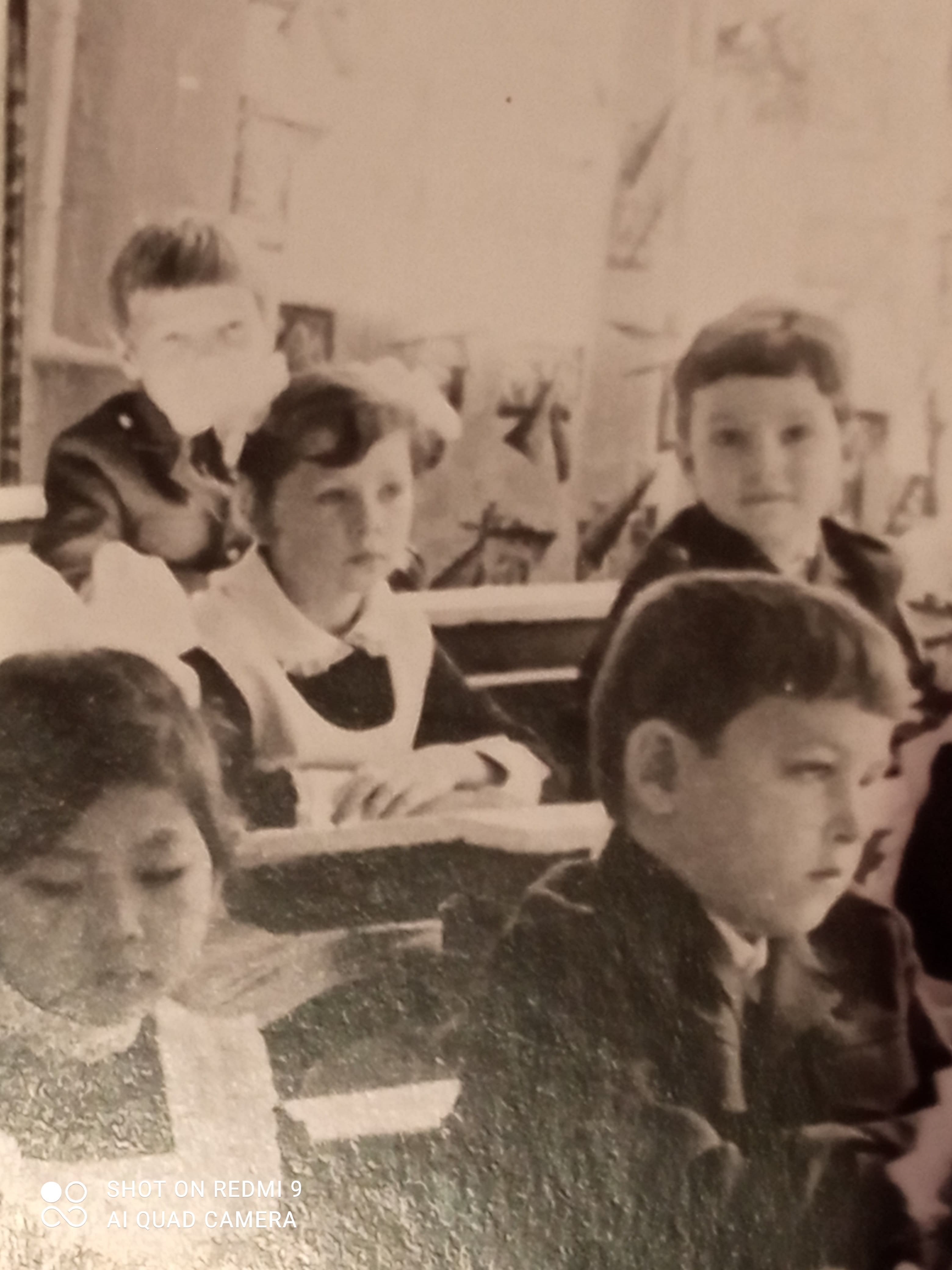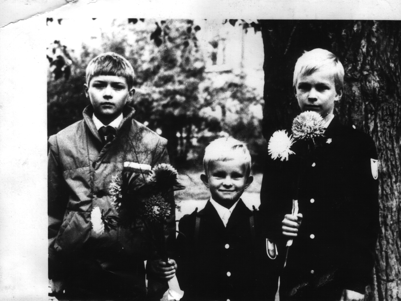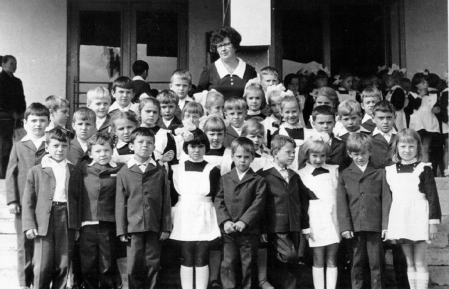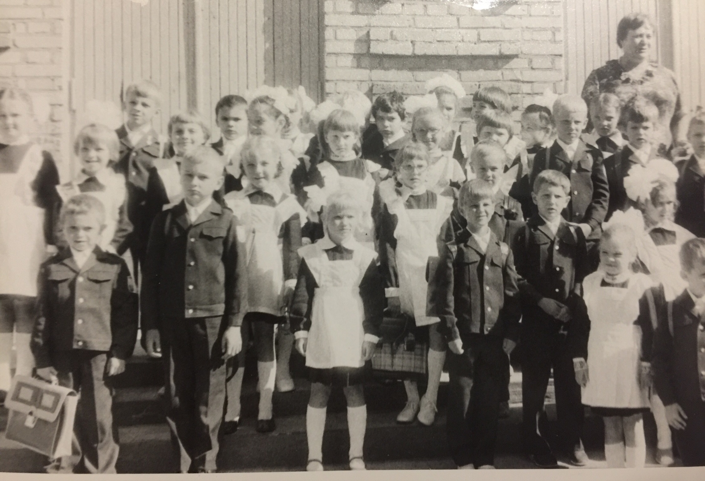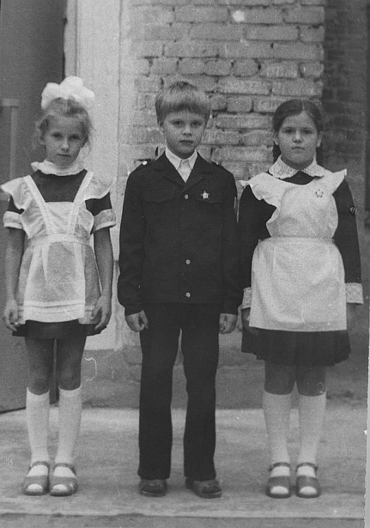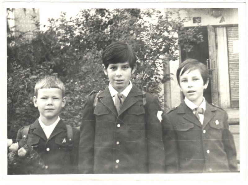 Первое сентября 1975г. Я в центре, наклонил голову, слева от меня Таня, справа (ниже меня) Вова. Это у здании школы после торжественной линейки.