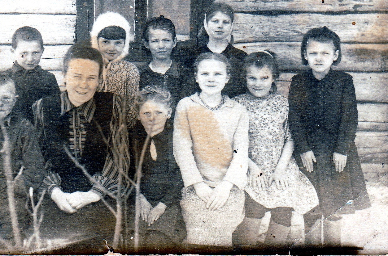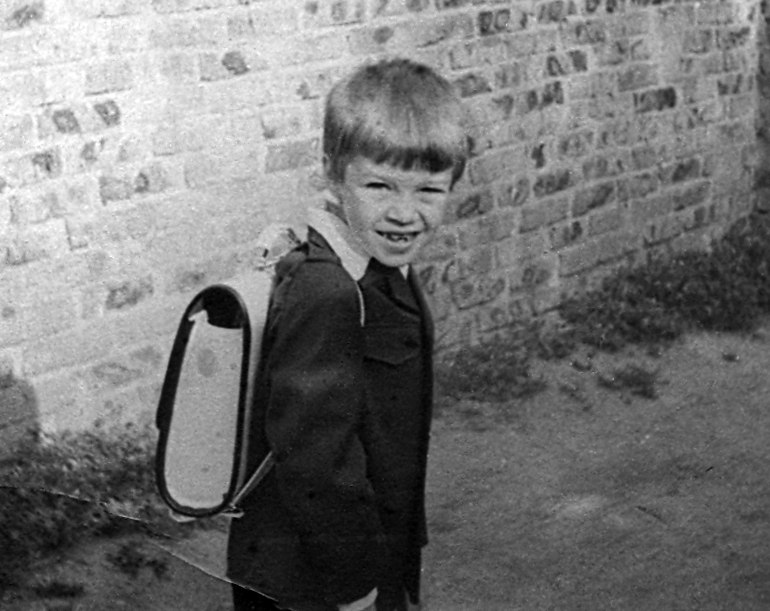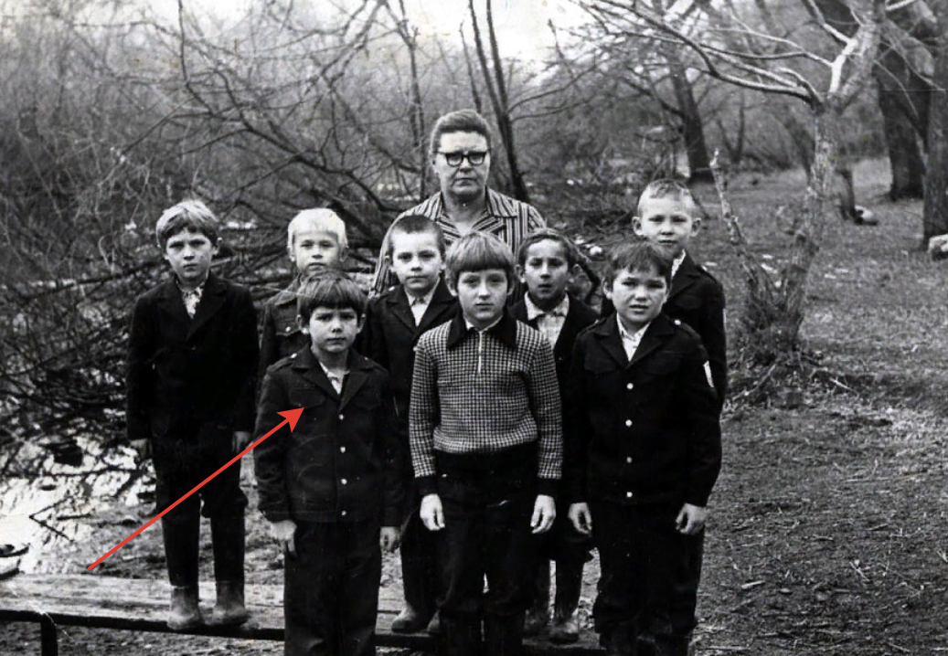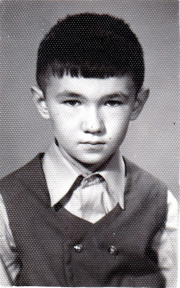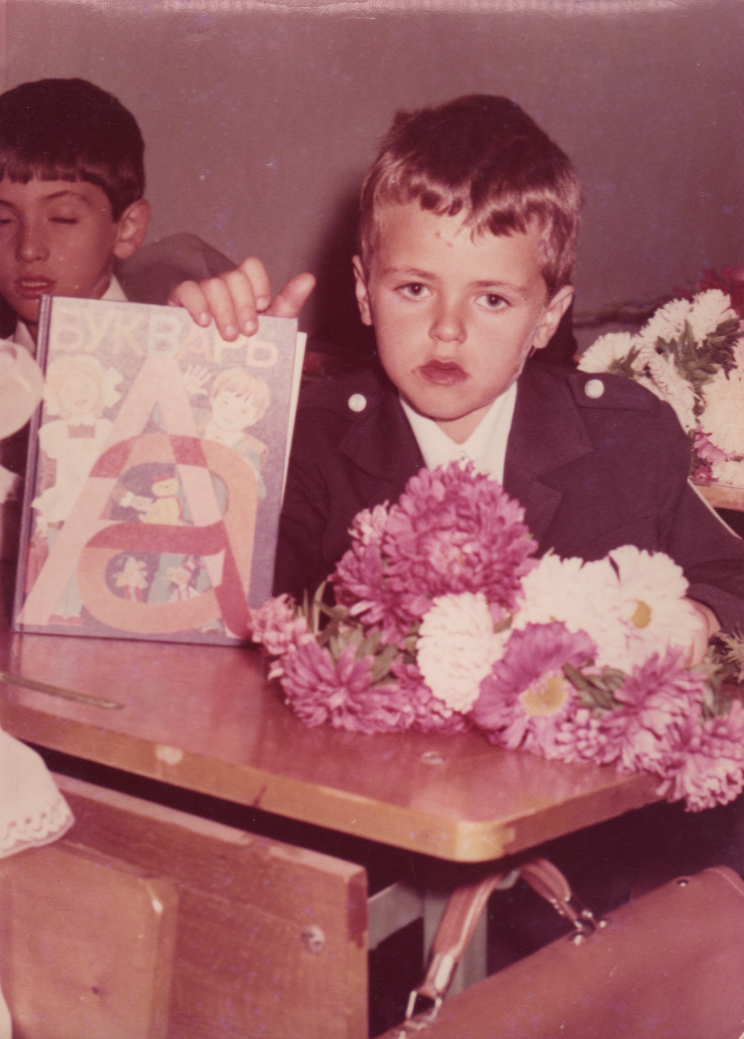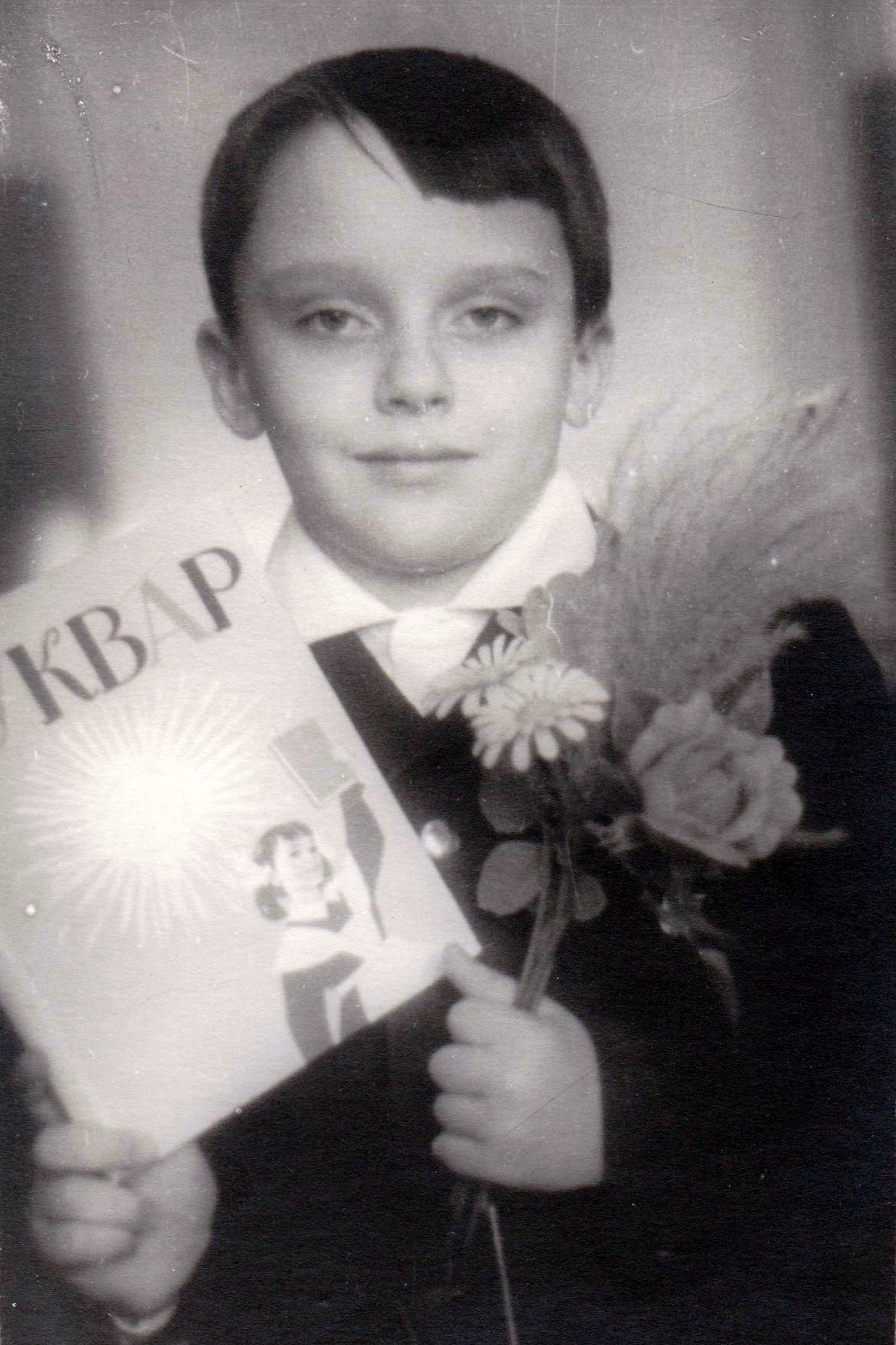 Первое сентября 1975г. Я в центре, наклонил голову, слева от меня Таня, справа (ниже меня) Вова. Это у здании школы после торжественной линейки.