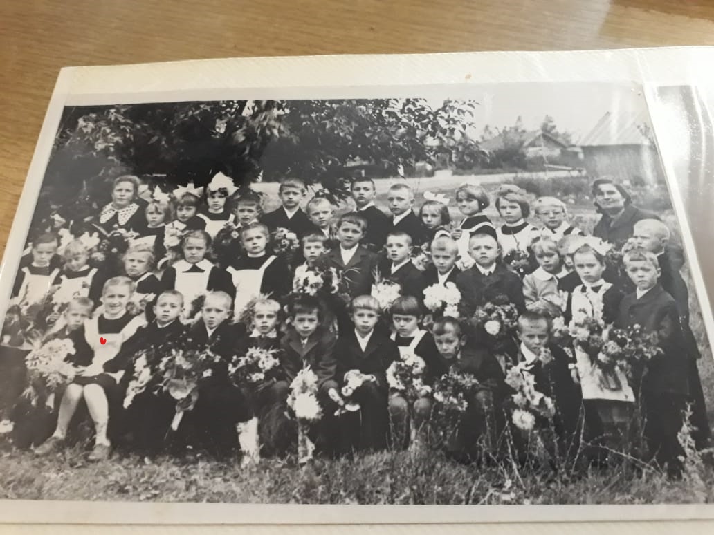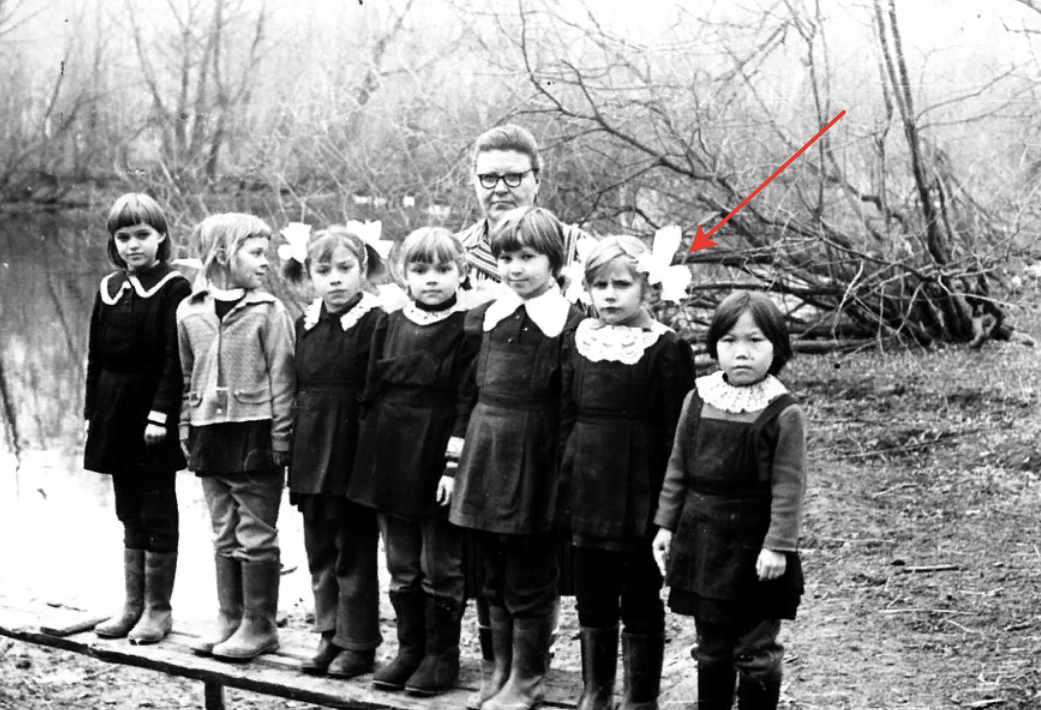Это 1973 год. Я в первом ряду красной галочкой отмечена. Не знаю почему я, такая крупная, сижу среди мелких. Может я уже была выше учительниц? ))