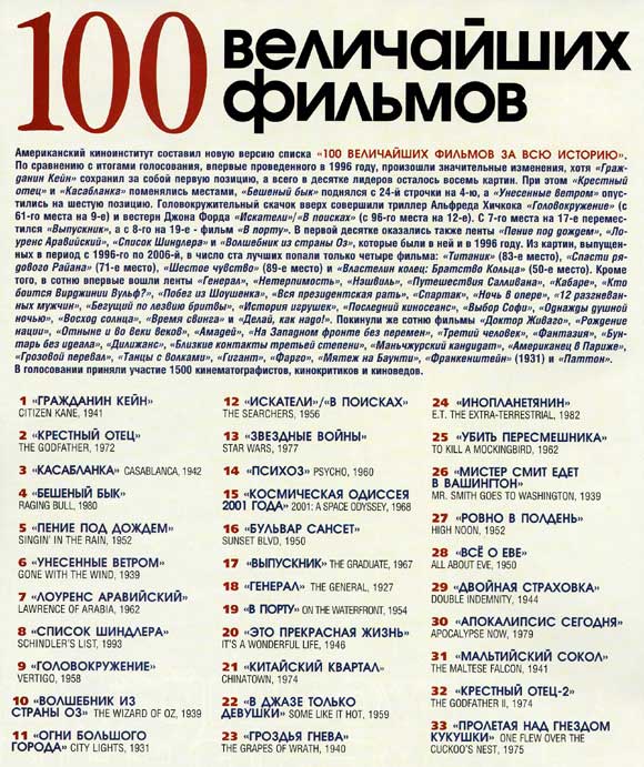 Такие списки всегда удивляют народ. А потому что верить им ну, никак нельзя. И вообще любовь американцев выставлять рейтинги "величайших фильмов", "самых громких скандалов", "самых сентиментальных сцен", "самых ушастых актеров" и т.п. с таким же отвратительным душком, что и награждения Оскаром. Спорно в этом списке очнеь много. И вылетевший из первой пятерки Чаплин, без которого, собственно, не было бы и Уэллса, и его же "Золотая лихорадка" и "Великий диктатор"(который вообще теперь отсутствует). Отсутствие многих фильмов-легенд, зато присутствие клюквенных (хотьи не плохих) "титаника", "Форреста", "Рядового райана" и т.д. Что-то как-то жидковато для списка "100 величайших фильмов в ИСТОРИИ КИНО". Даже в американском кино были фильмы посильнее....Или это все-таки те фильмы, которые принесли больше всего сборов и премий? Странно все это и очень относительно.