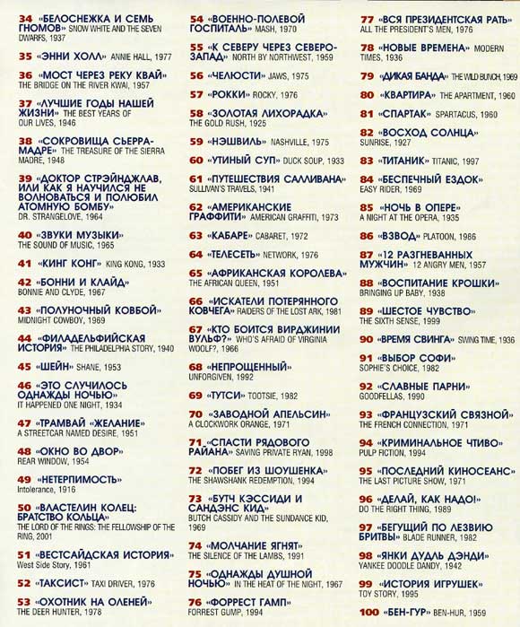 В целом, не самый худший список АМЕРИКАНСКИХ фильмов..... можно спорит по частностям, но в целом много достойных фильмов, которые must be have...