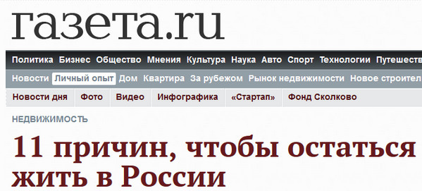 Статью с названием "11 причин, чтобы остаться жить в России" в "Газете.ру" очень остроумно поместили в рубрику "Недвижимость".