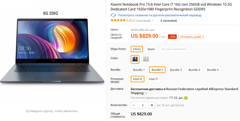 Я сегодня хочу себе купить ноутбук от Xiaomi (мой нынешний практически подох, да ему уже лет сколько). Выбирал между Xiaomi и Huawei. Остановился все-таки на Xiaomi. Изучал комплекты и цены разных поставщиков. В итоге нашел вот такой интересный вариант. Можно выбрать процессор (Intel i5 или Intel i7). Можно выбрать память (8/256 или 16/256) - это где выбор цвета. Ну и пять вариантов комплектации - там дополнительно наклейки на клаву плюс мышка с подставкой. Bundle 2 - это наклейки с русскими буквами. (Там вроде указано, что даже со склада в РФ можно заказать, но при этом выбрать ничего не дает, так что только из Китая.)