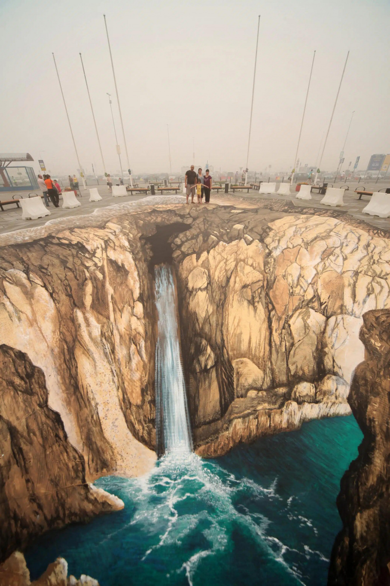 Такой впечатляющий эффект возникает - только разглядывая фоточки с тех мест, а не глазами когда ты там стоишь в реале. Потому что когда ты там - глаза не получают привычной разницы вида 3д-объекта с двух разных ракурсов, и сразу очевидна подмена - ты видишь, что разглядываешь плоскость с текстурой, и вау-эффекта не будет. Однако, мы привыкли додумывать 3д, когда рассматриваем плоские фотки. На фотке нет разницы: сфоткали реальный провал в асфальте, или правильно нарисованный - выглядит одинаково. Потому-то там фоткаются и потом всем показывают.