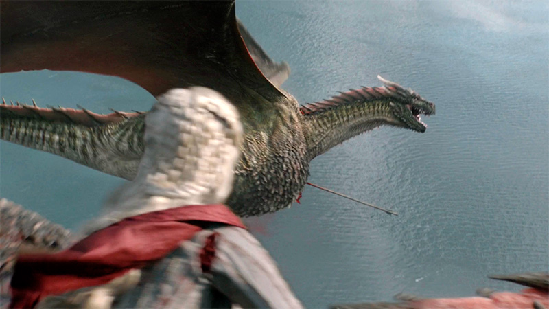 Флот Дейнерис встречает противный Эурон Грейджой, который спер у китобоев здоровенный гарпун и из этого гарпуна он запросто подстрелил одного дракона. Он просто не знал, что драконью броню ни один гарпун не пробьет, его только Ледяной Старикашка своим посохом может прошибить. А раз не знал - то и взятки гладки. Тем более что из гарпуна-то попасть в дракона - раз плюнуть, особенно если у тебя нет лазерного прицела.