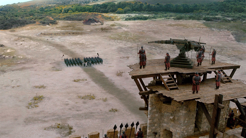 К Дейнерис выходит переговорщик, которому Тирион заявляет: "Так, быра освободили трон, тут Буйнорожденная пришла". Тот вежливо возражает.