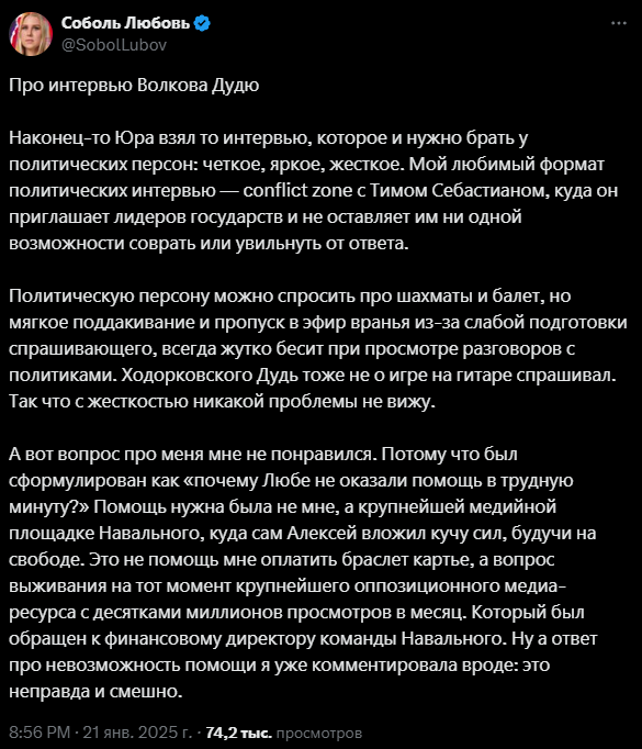 Ситуация с Любовью Соболь максимально некрасивая, и выглядит как будто ее слили специально. Это интервью было отличным моментом, чтобы перед ней извиниться.