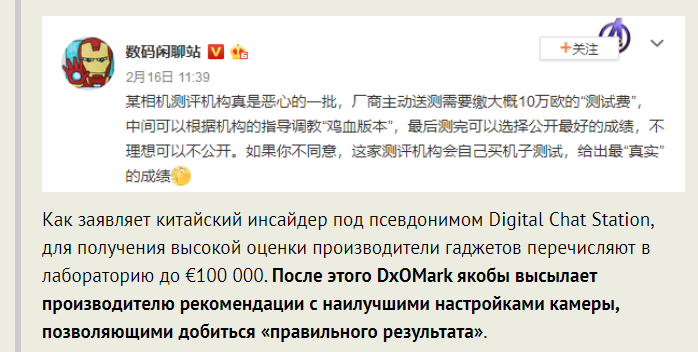Как заявляет китайский инсайдер под псевдонимом Digital Chat Station, для получения высокой оценки производители гаджетов перечисляют в лабораторию до €100 000. После этого DxOMark якобы высылает производителю рекомендации с наилучшими настройками камеры, позволяющими добиться «правильного результата».