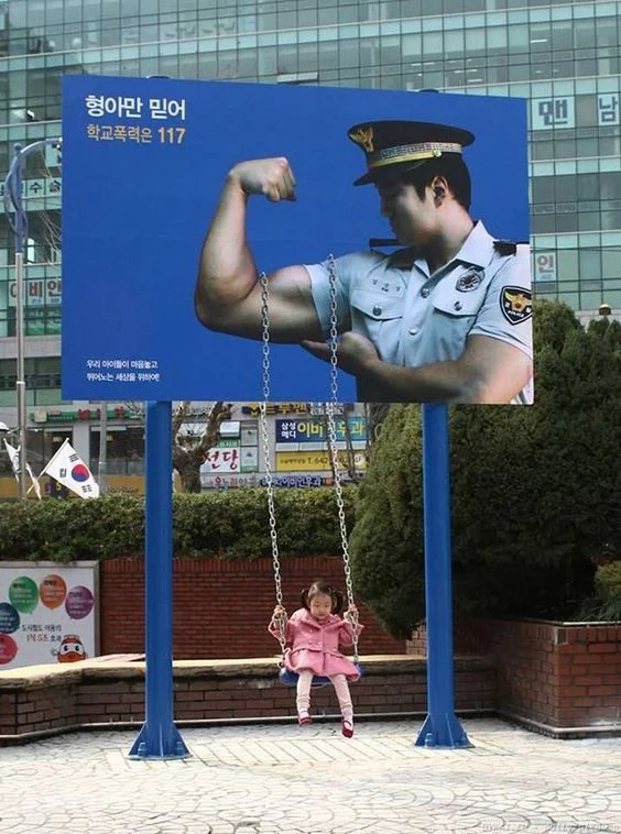 Кстати, надпись на корейском плакате гласит: "Доверяй только ему. О насилии в школе звони 117".