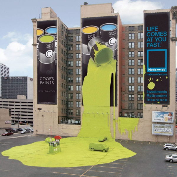 Мне помнится, появилась уличная реклама со сквозной дырой, сквозь которую зритель, по задумке, должен видеть настоящее небо. Через пару дней эти дыры заклеили листами с изображением голубого неба с облачками. А всё из-за технических требований к билбордам. Они, в частности, должны иметь прямоугольную форму, без сквозных вырезов и выступающих деталей, для безопасности.