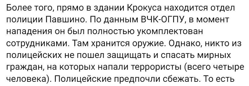 Более того, прямо в здании Крокуса находится отдел полиции Павшино. По данным ВЧК-ОГПУ, в момент нападения он был полностью укомплектован сотрудниками. Там хранится оружие. Однако, никто из полицейских не пошел защищать и спасать мирных граждан, на которых напали террористы (всего четыре человека). Полицейские предпочли сбежать. То есть подчиненные Владимира Колокольцева, вместо того, чтобы защищать людей, оказавшихся в опасности (а это их прямая обязанность) сбежали, спасая себя."(с)