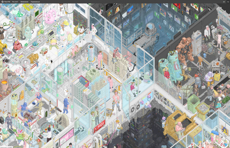Очень интересный проект Floor796. Это такая постоянно расширяющаяся анимационная сцена, показывающая жизнь 796 этажей огромной космической станции! Автор проекта и всей анимации - 0x00. Цель проекта - создать настолько огромную анимацию, насколько это возможно, с множеством отсылок к фильмам, играм, аниме и мемам. Все сцены рисуются в специальном online редакторе прямо в браузере одним человеком, как хобби. Процесс рисования некоторых блоков можно глянуть на youtube. Подробнее о том, как построен рендер анимации можно прочитать в статье на Хабре.