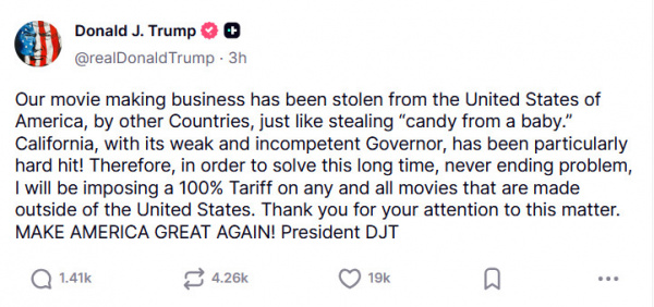 Наш кинобизнес был украден из Соединенных Штатов Америки другими странами, как будто это «конфетка у ребенка». Калифорния с ее слабым и некомпетентным губернатором пострадала особенно сильно! Поэтому, чтобы решить эту давнюю, бесконечную проблему, я введу 100-процентную пошлину на все фильмы, снятые за пределами Соединенных Штатов. Благодарю вас за внимание к этому вопросу. СДЕЛАЕМ АМЕРИКУ ВЕЛИКОЙ СНОВА! Президент Д. Трамп