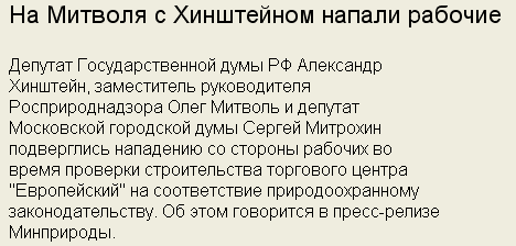 Начало звучит, в общем, симпатично. Правда, потом выясняется, что грозного дачесносца Митволя просто не пустили на объект, а Хинштейн, вероятно, слишком махал руками, поэтому ему, цитирую, "повредили руку".