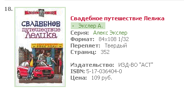 Книга "Свадебное путешествие Лелика" появилась в первой двадцатке продаж издательства "АСТ". Приятно. Там соперники суровые: Лукьяненко, Веллер, Паланик, Дашкова, Шелдон, Браун и так далее. Что интересно, как и "Ария..", книга стоит на 17-18 месте.