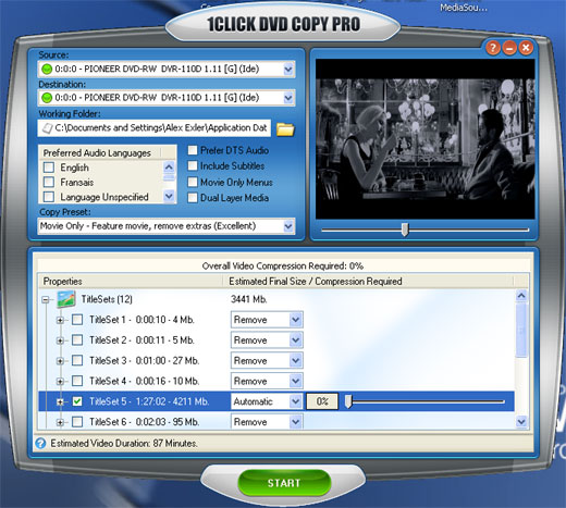 У 1Click DVD Copy, о которой я как-то писал, оказался типа как старший брат - 1Click DVD Copy Pro. Скачал, развлекаюсь. По сравнению с младшей версией все значительно удобнее и нагляднее - можно по отдельности легко и быстро включать/выключать в новый проект для записи все элементы меню, экстры и так далее и тому подобное. Плюс - аж три уровня преднастроек: стартовая, продвинутая и подробная. То есть можете, например, одним щелчком вырубить все меню или экстры, либо же включать/выключать все элементы по отдельности.