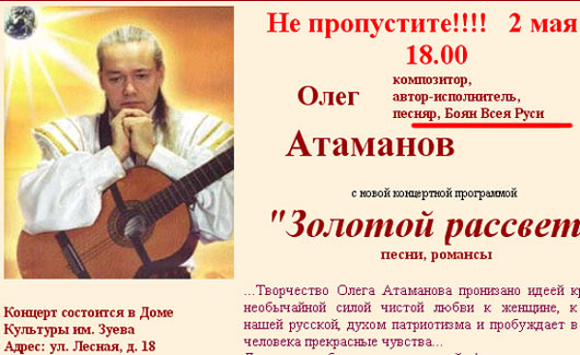 Вроде бы у нас появился шанс услышать главного баяна всея Руси, которого поминают в каждом ЖЖ, - вот он, голуба. 2 мая выступать будет, причем в святом для каждого истинного ценителя месте - ДК имени Зуева.