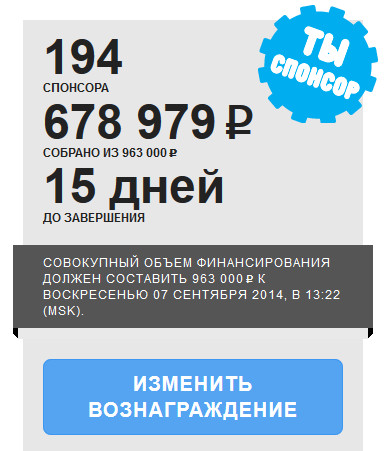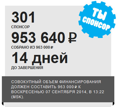 Несмотря на то, что команда уже собрала 2/3 нужной суммы, до окончания сбора денег остается всего две недели. Собрать надо каких-то 300 тысяч рублей - сумма, в общем, плевая, особенно если со всех по чуть-чуть.