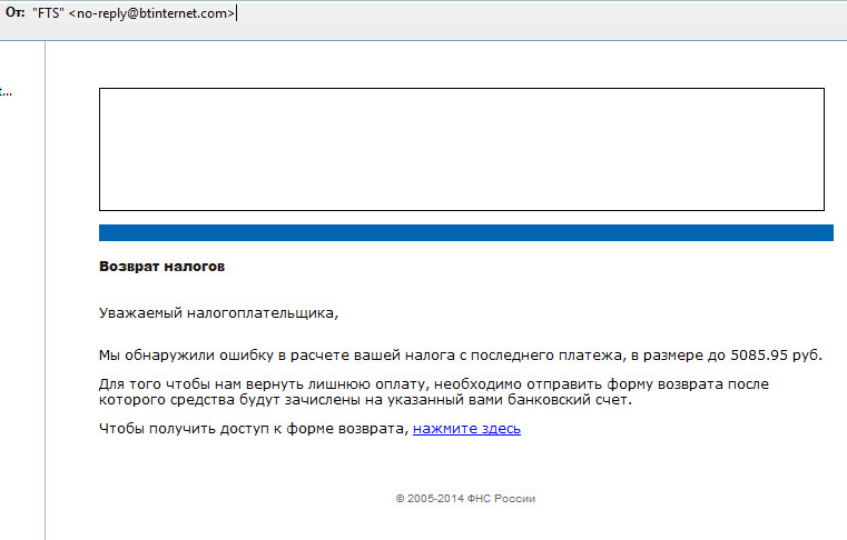 По Рунету сейчас идет волна писем якобы от ФНС, в которых предлагается вернуть вам "переплату", для чего, разумеется, надо нажать на спамерскую (или троянскую, я не проверял) ссылочку.