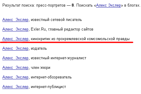 Прочитал у Антона Борисовича о новом яндексовском сервисе - пресс-портретах. Разумеется, полез тестировать на птичках-бабочках, то есть на себе. На просто "Экслер" выходит куча страниц, где процентов 80 - мои передачи ОТК с "Маяка" (текстовые версии). С чего они так круто индексируются - непонятно, но, в общем, по фиг.