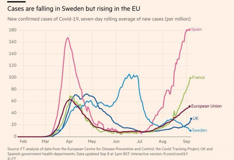 Очень показательный график, просто очень. На нем сначала нужно найти Испанию, где намордники носят все поголовно, и где тебя оштрафуют на 100 евро даже если ты в чистом поле или в глухом лесу идешь без намордника. Потом нужно найти Францию, где поголовно все носят намордники, и где тебя оштрафуют на €135, если тебя обнаружат без намордника в глухом лесу. Ну и потом Швецию, где намордники никто никогда не носил и не носит, и где происходили еще более дикие вещи, вроде того, что там никого не запирали по домам, как в Испании и Франции. Ну и после этого сделайте выводы. По-хорошему, эти выводы должны сделать испанские и французские чиновники, но, как показала практика, у них с мозгами - огромные проблемы, никакие выводы они не сделают.