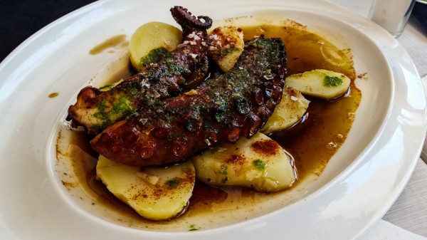 Хесус еще предложил попробовать их осьминога - оказалось очень вкусно. Осьминога хорошо приготовить трудно, блюдо очень непростое. И в наших краях осьминога обычно делают только по-галисийски: вареный осьминог, порезанный мелкими кусочками, политый маслом. Мне не сильно нравится. А вот этот вариант - заметно вкуснее.