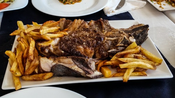 Окормляю Чер-ского в моей любимой кубинской рисоварне Хесуса в Мальграт-де-Мар. Мы - ребята совершенно неприхотливые в еде, поэтому что нам надо? Кусочек мяска и рыбку, более ничего!