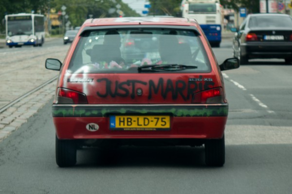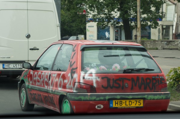 Нет, я знал, что есть традиция привязывать к машине молодоженов ленты с надписью "Только поженились", но я не знал, что эту надпись можно делать краской по машине. Впрочем, у этих веселых норвежцев на машине надписей и так хватает.