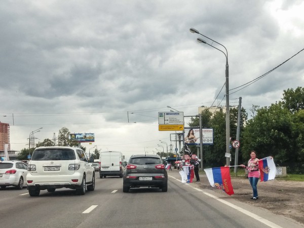 Как все изменилось. Раньше на этом месте на Ленинградке на выезде в область только проститутки стояли. А теперь - торгуют российскими флагами и прочей символикой. Причем флаги и символику активно разбирают.
