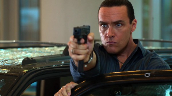 Скриншот изображает кадр из фильма: бравый милиционер, лучший из лучших, Влад Казадов врывается на джипе в банк, где в него в упор стреляют из автоматов три бандита. Одна пуля, как хорошо видно на скриншоте, пробила верх двери, но до Влада так и не долетела, потому что гвозди бы делать из этих людей! Или барабаны! Барабаны тоже можно, как я думаю.